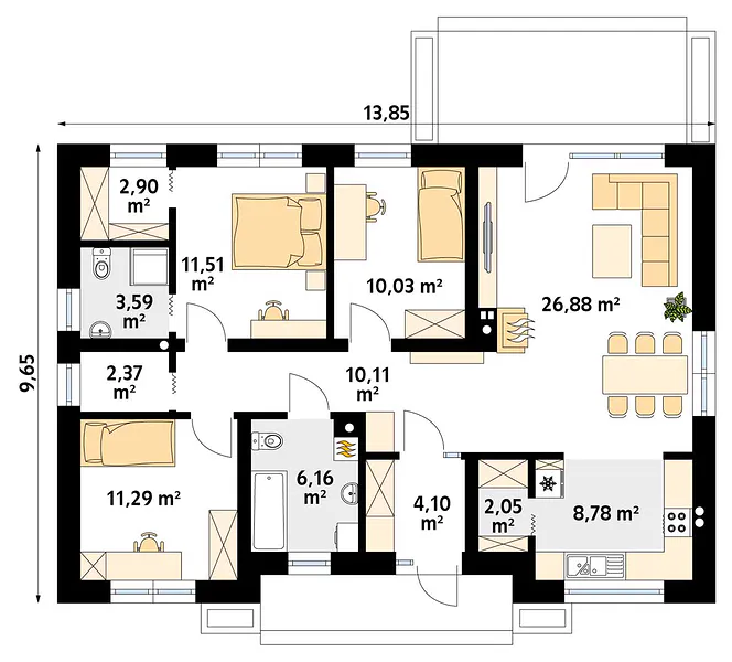 Avocado ist ein Entwurf für ein einstöckiges Haus, das den Bedürfnissen einer 3-4-köpfigen Familie gerecht wird. Der Nutzungsplan wurde in zwei Bereiche unterteilt. Der Wohnbereich besteht aus einem geräumigen großen Wohnzimmer mit Essbereich und einer offenen Küche mit Speisekammer. Im Schlafbereich sind drei Schlafzimmer vorgesehen. Eines davon ist das Elternschlafzimmer. Es verfügt über ein eigenes Bad und einen Kleiderschrank, was ein großer Vorteil des Entwurfs ist. Die beiden anderen Schlafzimmer sind für Kinder oder Gäste vorgesehen. Im Gemeinschaftsbereich befinden sich ein Badezimmer und ein Hauswirtschaftsraum. Die Materialauswahl für die Fassade verleiht dem Haus einen einheitlichen und modernen Charakter. Avocado ist ein energieeffizientes Projekt, das sich ideal für Grundstücke mit Zufahrt von Norden eignet.