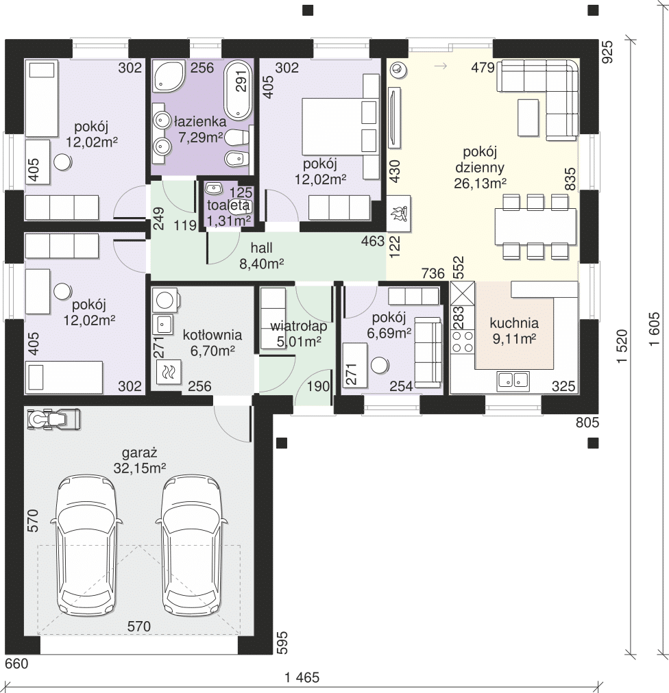 Das Haus in der Bukowa-Straße 27 ist ein energieeffizientes einstöckiges Haus mit einer Doppelgarage. Der funktionale Grundriss sieht einen offenen, sonnigen Wohnbereich vor, der aus einem Wohnzimmer und einer Küche besteht. Bukowa 27 verfügt außerdem über 3 Schlafzimmer, ein komfortables Badezimmer, eine zusätzliche Toilette und ein Arbeitszimmer, wodurch wir neben dem offenen Wohnbereich tatsächlich 4 Zimmer erhalten. Die Doppelgarage befindet sich an der Vorderseite. Es ist ein funktionaler Ort, an dem neben Autos auch Gartenmöbel, ein Rasenmäher oder ein Fahrrad Platz finden. Dank seiner durchdachten Konstruktion ist das Projekt kostengünstig in der Bauausführung und wirtschaftlich im Betrieb. Eine perfekte Variante für eine größere Familie.