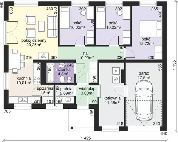 Das Hausprojekt „Dom przy Przyjemnej 5 bis” ist eine hervorragende Lösung für Personen, die über ein Grundstück mittlerer Breite verfügen. Das Haus zeichnet sich durch eine einfache Form aus, sodass seine Umsetzung einfach ist. Das Projekt gehört zur Kategorie der Häuser mit einem parallel zur Straße verlaufenden First, was aufgrund der in den Bebauungsbedingungen festgelegten Anforderungen wichtig ist. Das Haus wurde für eine freistehende Bebauung entworfen. Der Entwurf kann an der Grundstücksgrenze platziert werden, sodass er auch als Doppelhaus realisiert werden kann. Der Autor des Entwurfs hat eine nach vorne versetzte Einzelgarage vorgesehen. Es ist auch ein hervorragender Vorschlag für Personen, die ein Haus mit Satteldach suchen, da es eine kostengünstige und einfache Lösung ist. Das Projekt „Dom przy Przyjemnej 5 bis” ist ein einstöckiges Haus, was besonders für ältere Hausbewohner, Menschen mit Behinderungen oder mit kleinen Kindern wichtig ist. Der Autor des Entwurfs hat einen interessant gestalteten Wohnbereich vorgesehen. Das Haus verfügt über eine offene Küche, was eine moderne und praktische Lösung ist. Darüber hinaus ist die vorgesehene Speisekammer der ideale Ort für die Aufbewahrung von Konserven und Lebensmittelvorräten. Der Kamin im Wohnzimmer sieht nicht nur toll aus, sondern sorgt auch für angenehme Wärme an kälteren Tagen. Das Projekt umfasst ein komfortables Badezimmer. Der Schlafbereich besteht aus drei Schlafzimmern, sodass das Haus für eine Familie mit 2 bis 4 Personen geeignet ist. Der Raum kann auch als Gästezimmer oder Arbeitszimmer genutzt werden. Der Komfort des Hauses wird auch durch den darin enthaltenen Hauswirtschaftsraum erhöht. Die Kontinuität zwischen dem Innenbereich des Hauses und dem Garten wird durch eine attraktive Terrasse gewährleistet. Das Projekt wurde in Massivbauweise ausgeführt, wodurch das Haus bei Hitze angenehm kühl bleibt. In seiner Form sind Lösungen zu erkennen, die an den traditionellen Stil anknüpfen, was ideal für Menschen ist, die Klassik und Schlichtheit schätzen.