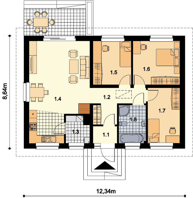 Das kleine und sehr funktionale Tebe eignet sich perfekt für eine Familie mit 2 bis 4 Personen. Dank seiner einfachen Form und geringen Abmessungen passt es sich fast jedem Grundstück an, auch kleinen. Der Schlafbereich umfasst drei geräumige Schlafzimmer, wobei sich die Fenster eines davon an der Vorderseite (auf der Eingangsseite) befinden. Angrenzend befindet sich ein gemeinsames Badezimmer, das den privaten Bereich komfortabel ergänzt. Die Zimmer gehen auf einen kleinen Flur hinaus, der als Puffer zwischen den Bereichen Schlaf-, Eingangs- und Wohnbereich dient. Der Flur ist so geräumig, dass darin Platz für einen Kleiderschrank und Kleiderbügel ist. Der Wohnbereich besteht aus einem offenen Raum, der sich entlang der Giebelwand erstreckt und Fenster hat, die nach drei Seiten ausgerichtet sind. Dies ermöglicht eine gute Belichtung während des ganzen Tages und eine ausreichende Belüftung. Das Wohnzimmer und das Esszimmer öffnen sich zur Außenterrasse, die eine Erweiterung des Gemeinschaftsbereichs darstellt. Auf der gegenüberliegenden Seite befindet sich eine halboffene Küche und daneben ein geschlossener Heizungsraum, der gleichzeitig als Speisekammer dient. Die geringe Kubatur, die kompakte Form und die Technologie, mit der das Gebäude errichtet wurde, ermöglichen Einsparungen bei den Heizkosten.