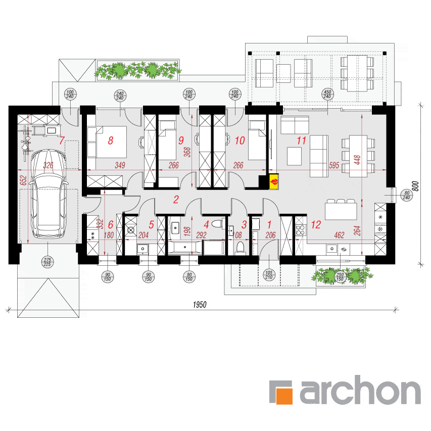 Ein interessantes Projekt eines kleinen einstöckigen Hauses mit einer Einzelgarage, das sich für die Umsetzung auf flachen Grundstücken eignet. Es handelt sich um ein auf einem rechteckigen Grundriss entworfenes modernes Gebäude mit einer einfachen Form, das mit einem Satteldach ohne Dachüberstand bedeckt ist. Es besticht durch sein beeindruckendes Aussehen und seinen funktional geplanten Nutzraum. Das Haus sieht dank seiner schön gestalteten Fassade, einer modischen Komposition aus hellem und graphitfarbenem Putz und Holzverkleidung, sehr attraktiv aus. Abgerundet wird das Ganze durch graphitfarbene Fenster und Türen sowie flache Dachziegel in passender Farbe. Der Windfang mit Platz für einen Schrank, eine Garderobe und eine Sitzbank führt zu einem funktional gestalteten Innenraum, in dem die Nutzungsbereiche klar definiert sind. Im offenen Wohnbereich wurde ein geräumiges Wohnzimmer mit Platz für bequeme Sofas entworfen, das dank der großzügigen Verglasung, die den Raum mit der von einer Pergola überdachten Terrasse und dem Garten verbindet, perfekt beleuchtet ist. Die Terrasse bietet neben Platz für einen Sommeressbereich auch Raum für eine Entspannungszone mit Gartenmöbeln. Der Essbereich im vorgestellten Entwurf bietet Platz für einen bequemen Tisch für die ganze Familie, an dem man gemütlich gemeinsam essen kann. Das Herzstück des Hauses bildet die Küche mit Kochinsel, deren Raum durch ein großes Frontfenster hervorragend beleuchtet wird. Die Küche ist mit funktionalen Arbeitsplatten und geräumigen Schränken ausgestattet. Im privaten Bereich des Hauses wurden drei geräumige Zimmer entworfen, jedes mit direktem Zugang zum Garten und Platz für Schränke. Darunter befinden sich ein komfortables Elternschlafzimmer und zwei Kinderzimmer. Vom Flur aus gelangt man zu einer Toilette und einem komfortablen Badezimmer mit Badewanne und Dusche, an das sich eine Waschküche anschließt. Am Ende des Flurs befindet sich ein Gasheizungsraum mit Vorratsraumfunktion. Von diesem Raum aus gelangt man in die Garage, die über einen separaten Ausgang zum Garten und Platz für Schränke sowie Sport- und Gartengeräte verfügt.