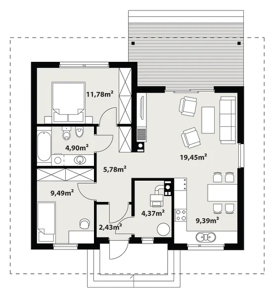 Das Gebäude Gaja drewniana ist eine Modifikation des beliebten Entwurfs Gaja. Im Gegensatz zur Basisversion hat dieser Entwurf eine kleinere Fläche. Das Projekt des Holzhauses Gaja eignet sich für die Umsetzung auf einem Grundstück mittlerer Breite. Das Haus zeichnet sich durch eine einfache Form aus, wodurch es kostengünstig zu bauen ist. Das Projekt gehört zur Kategorie der Häuser mit einem parallel zur Straße verlaufenden First, was sehr wichtig ist, wenn die Bebauungsbedingungen dies erfordern. Das Projekt wurde für Grundstücke konzipiert, die die Errichtung eines freistehenden Hauses ermöglichen. Das Projekt kann an der Grundstücksgrenze platziert werden, sodass es als Doppelhaus realisiert werden kann. Das Gebäude ist mit einem Satteldach gedeckt, das einfach und kostengünstig zu realisieren ist. Das Projekt „Gaja drewniana” ist ein einstöckiges Haus, wodurch es sehr bequem zu begehen ist. Der im Entwurf vorgesehene Wohnbereich wird sicherlich diejenigen zufriedenstellen, die gerne gemeinsame Momente mit der Familie genießen. Die offene Küche verleiht dem Innenraum mehr Weite und erleichtert die Kommunikation zwischen den Hausbewohnern erheblich. Der im Wohnzimmer befindliche Kamin macht den Innenraum noch gemütlicher. Der Autor des Entwurfs hat ein Badezimmer mit optimalen Abmessungen vorgesehen. Zwei Schlafzimmer eignen sich perfekt für eine 2-4-köpfige Familie. Der Raum kann auch als Gästezimmer oder Arbeitszimmer genutzt werden. Die Kontinuität zwischen dem Innenraum des Hauses und dem Garten wird durch eine attraktive Terrasse gewährleistet. Das Haus wurde in Skelettbauweise entworfen. In seiner Form sind Lösungen zu erkennen, die an den traditionellen Stil anknüpfen, weshalb es unabhängig von der Umgebung perfekt zur Geltung kommt.