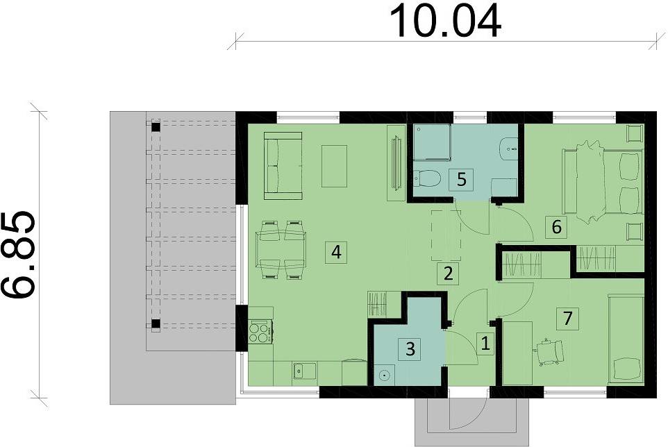 Ka131 ist ein bescheidenes einstöckiges Haus mit einer Wohnfläche von nur 51,69 m². Der völlig einfache, rechteckige Baukörper wird von einem Satteldach überdacht. Der Innenraum ist funktional aufgeteilt – der Wohnbereich ist vom Schlafbereich getrennt. Küche, Wohnzimmer und Esszimmer bilden einen gemeinsamen offenen Raum mit Zugang zur Terrasse. Direkt neben dem Windfang befinden sich zwei Schlafzimmer und gegenüber das Badezimmer. Das Haus verfügt außerdem über einen kleinen Hauswirtschaftsraum.