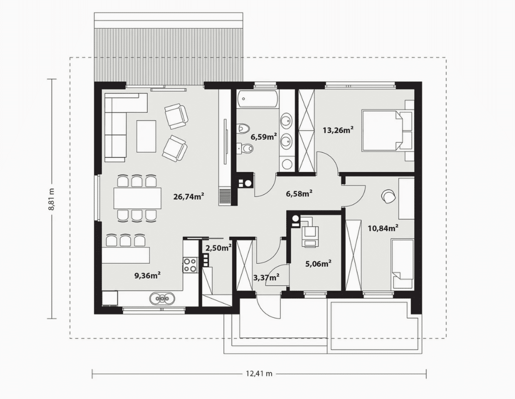 Lori drewniany ist ein Entwurf für ein einstöckiges Einfamilienhaus, das den optimalen Bedürfnissen einer 3-4-köpfigen Familie gerecht wird. Es handelt sich um ein sehr funktionales Haus mit einer klaren Aufteilung in verschiedene Bereiche. Der geräumige Wohnbereich ist eine einfache und klassische Kombination aus Wohnzimmer, Esszimmer und Küche, während der private Bereich aus 2 Schlafzimmern und einem Badezimmer besteht. Das Haus verfügt über eine große Terrasse, auf der man unabhängig von den Wetterbedingungen Zeit im Freien verbringen kann. Der Eingang zum Haus erfolgt über einen kleinen Vorbau, der vor Regen und Sonne schützt. Der Grundriss des Gebäudes ist rechteckig und mit einem Satteldach bedeckt. Diese Form des Gebäudes macht es einfach zu bauen und kostengünstig im Betrieb.