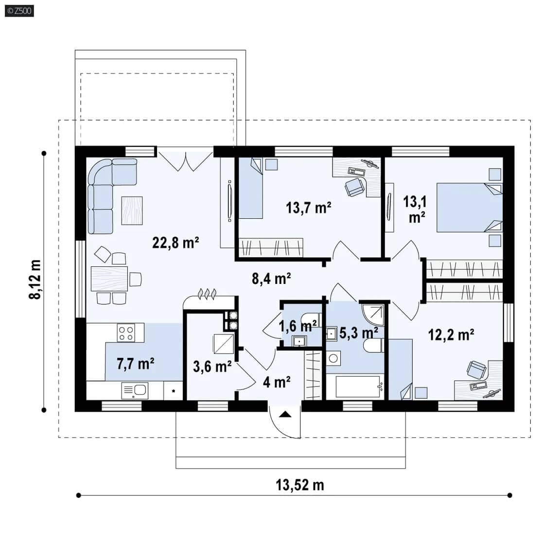Das Projekt Z241 ist ein funktionales einstöckiges Haus mit einer einfachen, eleganten Form und einem Satteldach, das mit Blick auf eine wirtschaftliche Bauweise und kostengünstigen Betrieb entworfen wurde. Die Version in Skelettbauweise garantiert eine schnelle Umsetzung, hohe Energieeffizienz und präzise Ausführung. Auf einer Fläche von ca. 89 m² sind ein komfortabler Wohnbereich mit einem hellen Wohnzimmer und Zugang zur Terrasse, eine offene Küche mit Platz für eine Speisekammer sowie drei geräumige Schlafzimmer, ein komfortables Badezimmer und eine Toilette vorgesehen. Die durchdachte Raumaufteilung minimiert die Verkehrsflächen und sorgt für volle Funktionalität bei kompakten Abmessungen. Z241 eignet sich perfekt als Haus für eine 3-4-köpfige Familie, auch auf kleineren Grundstücken. Die einfache Konstruktion und die geringe Bebauungsfläche machen dieses Projekt sowohl in der Bauphase als auch im späteren Gebrauch preislich attraktiv. Es ist die perfekte Wahl für Investoren, die ein modernes, energieeffizientes und kostengünstiges einstöckiges Haus suchen.