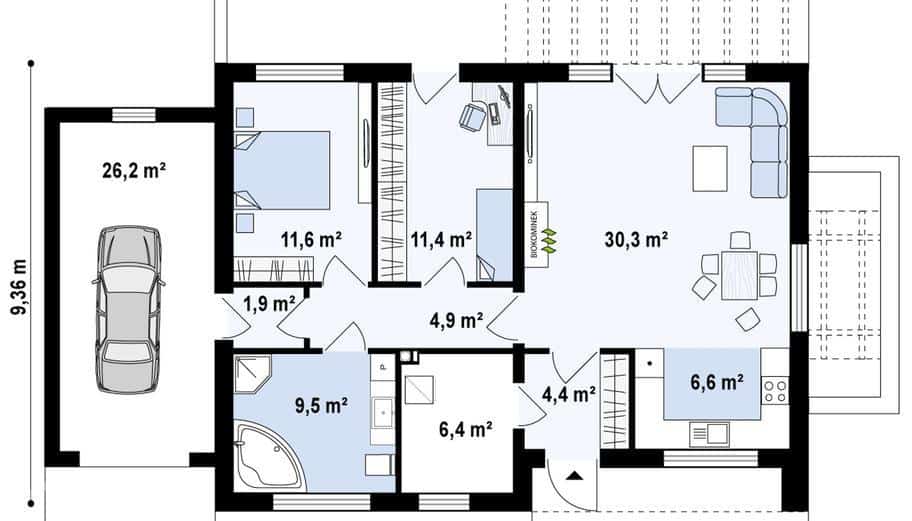 Das Projekt Z256+GL ist ein hervorragendes Angebot für alle, die ein einstöckiges Haus suchen, das Modernität mit Funktionalität verbindet. Es ist ein Raum, der mit Blick auf Komfort, Ergonomie und Ästhetik geschaffen wurde und den Bewohnern komfortable Lebens- und Erholungsbedingungen bietet.