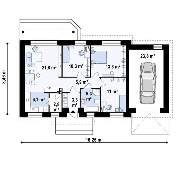 Z7 GP ist ein komfortables einstöckiges Haus mit Garage. Dieses Projekt hat eine sehr funktionale Raumaufteilung: Auf einer kleinen Nutzfläche finden sich ein geräumiges Wohnzimmer mit Küchenzeile, ein Hauswirtschaftsraum, ein großes Badezimmer und drei Schlafzimmer. Darüber hinaus befindet sich im Gebäude eine Einzelgarage.
