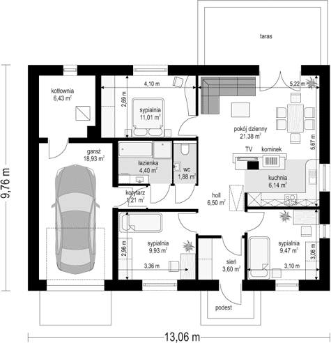 Dieses Projekt hat eine einfache und unkomplizierte Form und Konstruktion. Dank seiner sparsamen Form und seiner Einfachheit ist es leicht zu bauen und daher kostengünstig. Gleichzeitig ist es funktional und erfüllt zu hundert Prozent die Anforderungen an ein komfortables Wohnen für eine vierköpfige Familie. Man betritt das Haus durch einen Vorraum mit einem großen Kleiderschrank, der zum Flur und zum Wohnzimmer führt. An den Seiten, unweit des Eingangs, befinden sich die Kinderzimmer, weiter hinten liegt der Wohnbereich – mit einer durch eine Kamin- und Fernsehwand abgetrennten Küche und einem Wohnzimmer mit einer Sitzecke und Platz für einen Esstisch. Weiter hinten befindet sich das etwas vom Rest des Innenraums abgetrennte Elternschlafzimmer. Vom Flur aus gelangt man über einen kleinen Korridor zum Badezimmer und WC und weiter hinter einer Doppeltür zur Garage und zum Heizungsraum. Der Entwurf des Hauses Zosia 6 ist angesichts der geringen Nutzfläche sehr funktional und verfügt über ein umfangreiches Raumprogramm. Hier gibt es keinen verschwendeten Raum – alles ist logisch und praktisch angeordnet. Das Haus hat ein schlichtes und ansprechendes Design. Ein entscheidender Vorteil dieses Hauses ist seine Einfachheit und Funktionalität, die sich in einem maximalen Investitionsergebnis für wenig Geld niederschlagen.