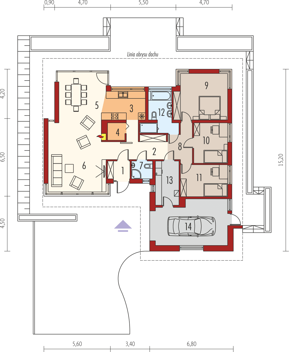 The Alberta G1 house project is an ideal proposal for people who have a plot of medium width. The house has an L-shaped floor plan, which gives it an original appearance. The ridge runs parallel to the street, which is often specified in development plans. The house was designed as a detached building. The architect has provided for a single garage set forward. The design is ideal for anyone interested in a house with a gable roof, as this allows for significant savings. The entrance to the building faces south, which is an important solution for people whose plot is accessible from this side. The Alberta G1 project is a single-story house, making it very easy to walk around. The living area provided for in the design will certainly satisfy those who enjoy spending time with their family. It includes, among other things, a kitchen that is the ideal solution for both traditional and modern housewives. Another useful space is the spacious pantry. The living area also includes a spacious living room and dining room. The fireplace in the living room not only looks great, but also provides pleasant warmth on colder days. The design includes two bathrooms, which makes morning preparations for going out much easier. The sleeping area consists of three bedrooms, which are well suited for a family of 2-4. The room can also be used as a guest room or study. The terrace is the ideal place for family gatherings and moments of relaxation. The building was designed using solid construction methods. Its shape features solutions that tie in with modern style and meet even high expectations in terms of visual appeal.